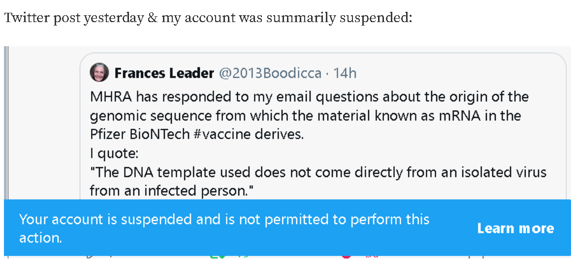 “I set about proving that the vaccine has been created from a computer generated genomic sequence & not one isolated from an infected person, either in Wuhan or anywhere else in the world since.”–Frances Leader