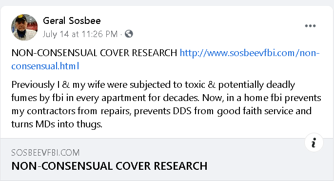 In a July 14 Facebook post, Geral Sosbee once more whistleblows on “Non-Consensual Cover Research” which targets of FBI/NSA Secret Policing are driven into, their entire lives targeted as their bodies, brains, and actions are assaulted nonstop, 24/7, in hideous and inhumane experimentation by covered parties which include factions of the military, Special Forces, and CIA. This is experimentation to rival the crimes of the Nazis in concentration camps during World War II and the crimes of the CIA exposed by the Church Committee in 1974.